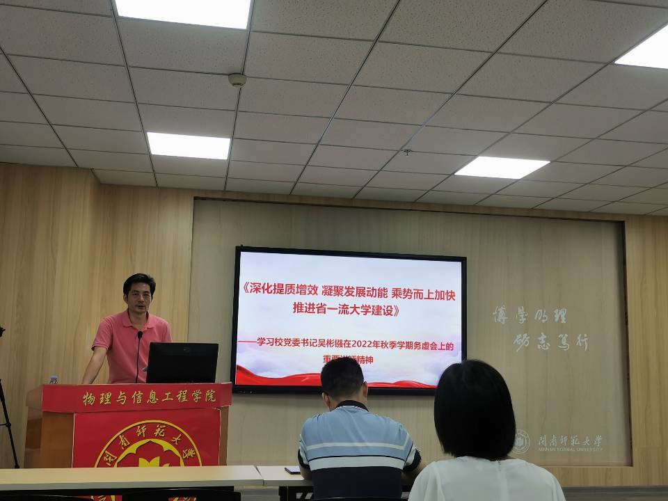 杨红和首先传达了学校2022年秋季学期务虚会及相关文件精神,组织大家认真学习公司党委书记吴彬镪、董事长李顺兴分别在2022年学校秋季学期工作务虚会上所做的《深化提质增效 凝聚发展动能 乘势而上加快推进省一流大学建设》《汇聚共识 深化融合 真抓实干 开辟新时代复合型内涵发展新路径》重要讲话精神。