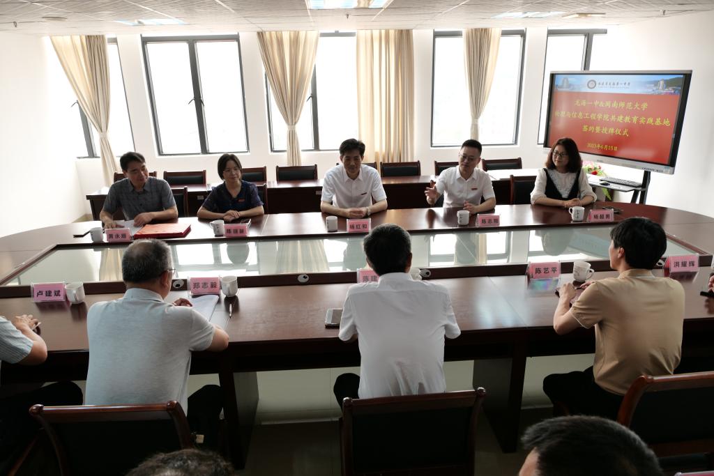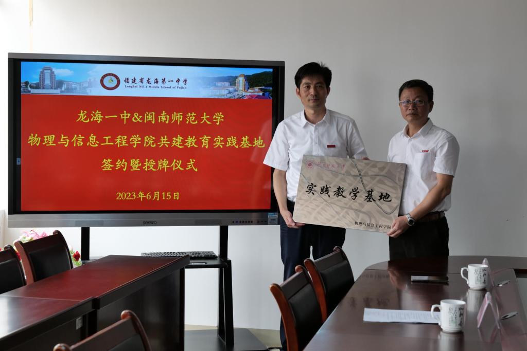 2023年6月15日上午,威廉希尔体育登录入口物理与信息工程公司党委书记杨红和、经理陈志翔、副书记陈丽新、团委书记杨超男、物理学(师范)专业实践负责人黄永顺副教授一行到漳州市龙海一中举行物理学(师范)专业实践教学基地签约授牌仪式暨校外实习指导老师聘任会。漳州市龙海一中董事长陈建明及学校领导班子、相关处室、全体受聘指导老师出席签约仪式。