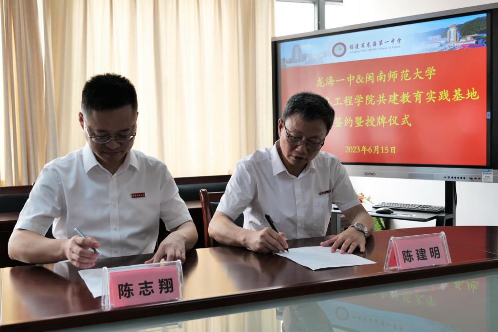 陈志翔高度评价了龙海一中的校园文化、育人成果,对陈建明董事长的教育理念教育情怀表示钦佩。实践教学基地将为学院师范生成长成才提供沃土,希望双方能够依托基地建设在实践教学、课题研究、人才培养等方面开展全方位深度合作,建立深度的教育科研融通机制,在合作中相互促进,实现共赢。随后,陈志翔经理与陈建明董事长代表双方,签订“共建实践教学基地”合作协议。